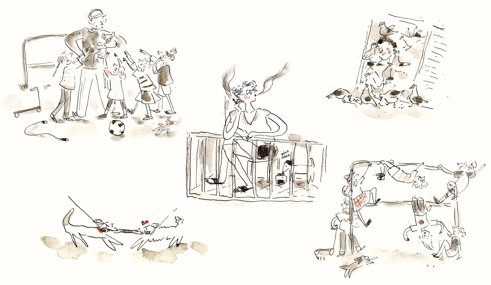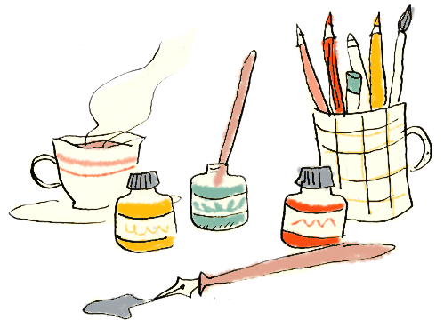 I create my illustrations using traditional techniques - watercolour, gouache, ink, charcoal and crayons (and yes, my desk is always messy)!